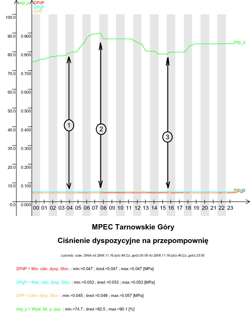 W punkcie 1 zaznaczono, gdy aktualne ciśnienie dyspozycyjne mierzone na przepompowni jest mniejsze niż dolna granica widełek dyspozycji, co powoduje zwiększenie wysterowania pompy poprzecznej. W punkcie zaznaczono, gdy aktualna wartość ciśnienia dyspozycyjnego jest większa od górnych widełek dyspozycji, co powoduje zmniejszenie wysterowania pompy: poprzecznej W punkcie 3 zaznaczono, gdy ciśnienie dyspozycyjne znajduje się w widełkach. W tym przypadku pompa: poprzeczna nie podejmuje żadnych ruchów.