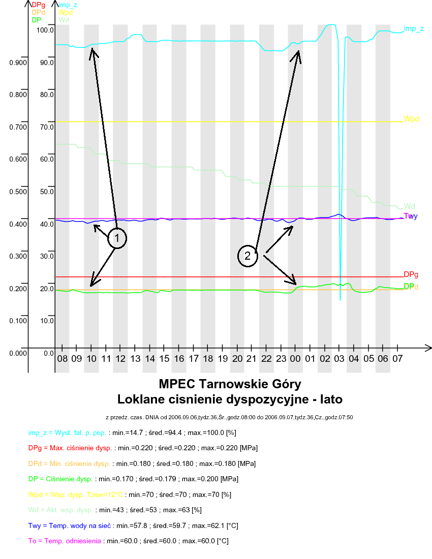 W punkcie 1 zaznaczono, gdy aktualne ciśnienie dyspozycyjne (funkcja 12) jest mniejsze niż dolna granica widełek dyspozycji (funkcja 11). W tym przypadku daje się zauważyć brak stabilizacji temperatury, gdyż regulator stara się najpierw doprowadzić wartość ciśnienia dyspozycyjnego do takiej wartości ażeby znalazło się ono między widełkami poprzez zwiększanie wysterowania pompy poprzecznej. W punkcie 2 przedstawiono sytuację, gdy aktualna wartość ciśnienia dyspozycyjnego (funkcja 12) znajduje się w widełkach i regulator przystępuje do stabilizacji temperatury odpowiednie zwiększenie wysterowania pompy poprzecznej.