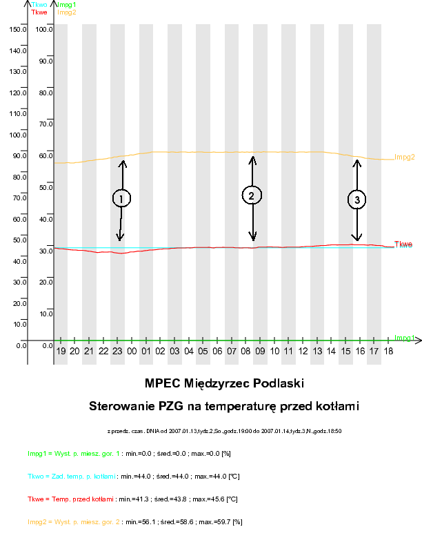 W sytuacji 3 - wzrasta zapotrzebowanie na moc ciepłowni (widełki mocy "podnoszą się"), wysterowanie pomp zmieszania gorącego spada - co powoduje wzrost mocy ciepłowni; w sytuacji 2 - zapotrzebowanie na moc stabilizuje się i wysterowanie pomp pozostaje stałe; sytuacja 1 jest odwrotna do 3 - widełki mocy "opadają", wysterowanie falownika rośnie - co powoduje spadek wydajności ciepłowni.